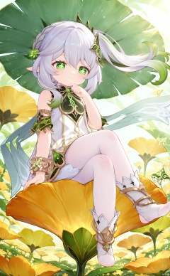 1girl, nahida \(genshin impact\),Sitting on a flower with crossed legs, looking down at you from a high position, with one hand supporting your chin. White silk stockings
