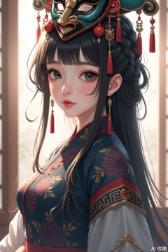 1girl, solo, long hair, looking at viewer, blush, bangs, black hair, hair ornament, long sleeves, jewelry, closed mouth, upper body, braid, short sleeves, earrings, indoors, blurry, black eyes, lips, window, single braid, makeup, mask, blurry background, chinese clothes, tassel, hair over shoulder, beads, red lips, mask on head, layered sleeves, short over long sleeves, tassel earrings,Mask,Colorful