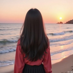 A girl, alone, with long hair, wearing rose red clothes, black dress, black hair, outdoors, by the water, looking from behind, facing the sea, beach, sunset, sunshine, back to the camera.