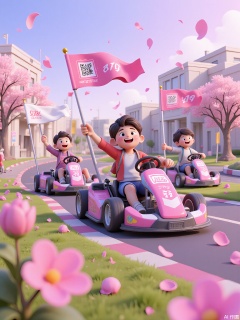 Whimsical 3D illustration of students racing solar-powered go-karts through campus gardens, kart designs shaped like books and musical notes, checkpoint flags with QR codes, laughing expressions, cherry blossom petals swirling in wind, soft pastel gradients with neon accents, playful physics defying gravity slightly.
