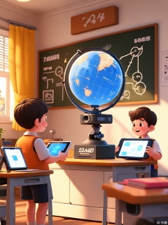 QNJ, Inspirational 3D scene with a young inventor presenting a holographic globe to classmates, data streams flowing from tablet to projection, diverse audience reacting with excitement, classroom windows showing futuristic cities, warm afternoon light, desks with 3D printers and robot kits, chalkboard equations dissolving into stars, optimistic color palette.