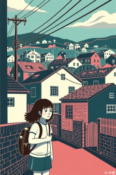 1girl, power lines, solo, cloud, sky, outdoors, black hair, backpack, cloudy sky, scenery, bag, utility pole, building, house, black eyes, looking at viewer,lino,Reduction linocut