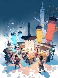 XHCH, Digital drawing of a summer festival scene, revelers in yukata laughing under paper lanterns, children holding spinning goldfish scoops, food stalls with grilling takoyaki, fireworks bursting in indigo sky, Mount Fuji silhouetted in distance, vibrant hues of crimson and turquoise blending with warm amber glows.
