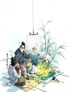 XHCH, Digital drawing of a rainy day ikebana arrangement, elderly sensei guiding student's hands among peonies, raindrops sliding down paper lanterns, wooden tools laid on tatami, backdrop of mist-shrouded bamboo forest, dewdrops glowing on spiderweb strands, tranquil emerald and slate palette.
