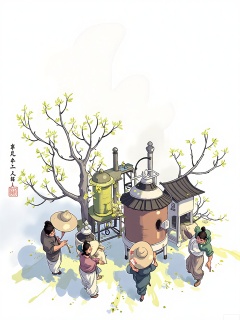 XHCH, Digital drawing of a spring tea harvest, farmers in conical hats picking tender leaves at dawn, dew glistening on silver tea bushes, traditional processing house with wood-fired kiln, mist softening distant mountain ridges.