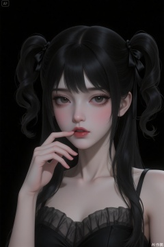 A woman with black hair, wearing a black tulle dress and having black eyes. She is biting her lips. There is a black ribbon in her hair, which hangs down gracefully. At the back, she has slightly curled double ponytails. Against a black background, there is blush on both sides of her face, and she has tear troughs. Her fingers are exquisitely detailed. There is soft lighting, and the picture has a slight shimmer. It conveys a sense of consciousness, and the picture seems to be glowing. The background has a black texture. It is a CG illustration, exuding a sense of mystery and coldness, with high quality, high standard, and a clear image.