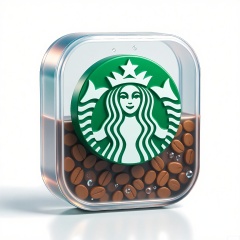 BTM, A 3D-rendered logo of Starbucks, featuring a translucent emerald-green siren emblem with coffee bean details visible through glass-like material. Condensation droplets trickle down the surface onto a frosted milk-white background.