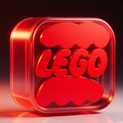 BTM, A 3D-rendered logo of LEGO, featuring stacked brick elements in translucent candy-apple red plastic, frozen mid-construction with fingerprint textures on surfaces. The background simulates studio lighting with softbox reflections.