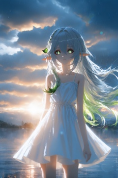 masterpiece,best quality,amazing quality,very aesthetic,absurdres,newest,highres,1girl,solo,long hair,looking at viewer,bangs,hair ornament,dress,hair between eyes,bare shoulders,green eyes,collarbone,braid,grey hair,sidelocks,multicolored hair,outdoors,green hair,sky,alternate costume,pointy ears,cloud,white dress,blurry,symbol-shaped pupils,gradient hair,alternate hairstyle,cloudy sky,rain,hair down,nahida \(genshin impact\),backlighting,blue and white theme,depth of field,cinematic lighting,light particles,lens flare,(artist:quasarcake:0.8),extreme aesthetic,(wlop:0.6),aesthetic,Emotionalization,temperate atmosphere,in the style of fashion photography,(Visual impact:1.2),giving the poster a dynamic and visually striking appearance,impactful picture,colorful,splash of color,movie perspective,