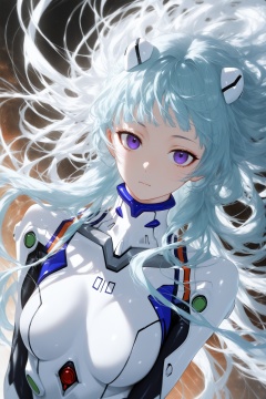 masterpiece,best quality,amazing quality,very aesthetic,absurdres,newest,highres,1girl,maomao \\(kusuriya no hitorigoto\\),plugsuit,pilot suit,white bodysuit,looking at viewer,head tilted,light blue long hair,hair blowing in the wind,(intricate details),(dynamic angle),fluffy hair,air bangs,