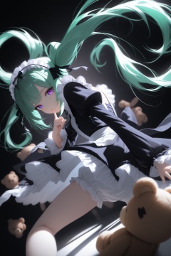 masterpiece,best quality,amazing quality,very aesthetic,absurdres,newest,in the style of fashion photography,light particles,cinematic lighting,Visual impact,sharp focus,Emotionalization,depth of field,dynamic pose,dutch angle,extreme aesthetic,scenery, 1girl, solo, long hair, dress, twintails, underwear, purple eyes, green hair, looking back, virtual youtuber, maid headdress, stuffed toy, stuffed animal, black background, finger to mouth, lolita fashion, teddy bear, bloomers, gothic lolita
