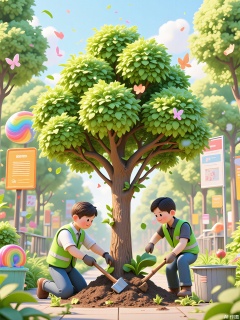 LDJ, A 3D-rendered cartoon poster featuring environmentalists in green vests planting a tree that blooms into a confetti-filled canopy. The park background includes recycling bin sculptures, butterfly balloons, and a rainbow-colored soil mound.