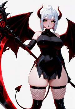 solo, hhg_narissa, gothic, 1girl, demon girl, yellow eyes, slit pupils, demon horns, makeup, black lipstick, eyeshadow, ahoge, white hair, multicolored hair, short hair, bangs, large breasts, (thick thighs:1.2), wide hips, tail, demon wings, black dress, short dress, side slit, sleeveless, fishnets, thighhighs, black gloves, elbow gloves, scythe, holding scythe, standing, looking at viewer, bedroom eyes, simple background, white background, <lora:ponyxl\cfg_scale_boost:0.8> <lora:IL\KMS_HHG_Narissa_IL-000007:1>