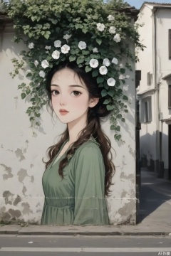 a medium-angle shot of a woman's head is adorned with a wreath of white flowers and green leaves. The woman's hair is long