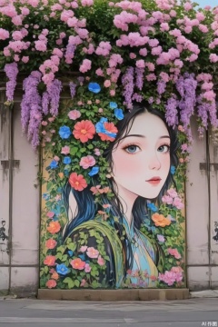 "Street art mural of a goddess with living flower hair, peonies blooming from roots at the scalp transitioning into wisteria waterfalls at the ends, honeybees and hummingbirds interacting with the botanical locks, Art Nouveau flowing lines combined with graffiti splatter effects, UV reactive paints for night glow, trompe l'oeil vines breaking the wall's plane --v 5 --ar 3:4"