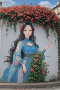 hua,The image depicts a mural of a young woman with long black hair and a serene expression. She is wearing a blue garment. Her hair is adorned with vibrant red and pink roses,which cascade down her head and shoulders. The background is a light-colored wall,and the mural is surrounded by a lush arrangement of green foliage and red rose petals at the bottom. The sky above is clear with a few clouds,creating a peaceful and artistic atmosphere.,