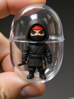 SBJN, Photo of a small figurine of a ninja with a black suit and a red mask, wearing a small sword. The figurine is held in a clear glass capsule by a hand, with a dark gray background. The ninja has a focused expression, with narrowed eyes and a determined gaze. The lighting is soft and even, highlighting the details of the figurine. The style is realistic, with a focus on the details and textures of the figurine and the glass capsule.