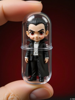 SBJN, Photo of a small figurine of a vampire with pale skin and red eyes, wearing a black cloak. The figurine is held in a clear glass capsule by a hand, with a dark red background. The vampire has a mysterious expression, with a smirk and a twinkle in his eye. The lighting is soft and even, highlighting the details of the figurine. The style is realistic, with a focus on the details and textures of the figurine and the glass capsule.