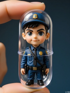 SBJN, Photo of a small figurine of a police officer with a blue uniform and a badge, wearing a small gun. The figurine is held in a clear glass capsule by a hand, with a dark blue background. The police officer has a serious expression, with narrowed eyes and a determined gaze. The lighting is soft and even, highlighting the details of the figurine. The style is realistic, with a focus on the details and textures of the figurine and the glass capsule.