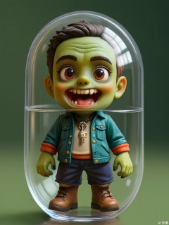 SBJN, Photo of a small figurine of a zombie with green skin and tattered clothes, wearing a small brain. The figurine is held in a clear glass capsule by a hand, with a dark green background. The zombie has a grotesque expression, with bulging eyes and a gaping mouth. The lighting is soft and even, highlighting the details of the figurine. The style is realistic, with a focus on the details and textures of the figurine and the glass capsule.