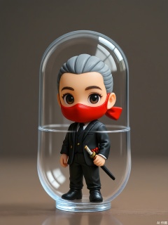 SBJN, Photo of a small figurine of a ninja with a black suit and a red mask, wearing a small sword. The figurine is held in a clear glass capsule by a hand, with a dark gray background. The ninja has a focused expression, with narrowed eyes and a determined gaze. The lighting is soft and even, highlighting the details of the figurine. The style is realistic, with a focus on the details and textures of the figurine and the glass capsule.