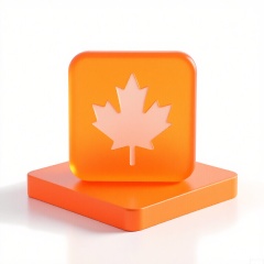MSCZ, A photograph of a small, frosted, burnt-orange pentagon logo icon with a matte texture, positioned on a square, transparent, burnt-orange base. The logo incorporates a stylized maple leaf motif in white. The plain white backdrop emphasizes the earthy burnt-orange hue and angular geometry. Diffused lighting highlights the geometric edges and frosted finish.
