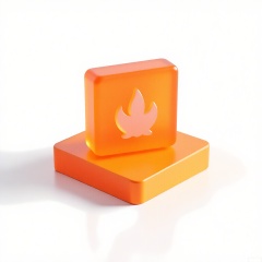 MSCZ, A photograph of a small, frosted, burnt-sienna pentagon logo icon with a matte texture, positioned on a square, transparent, burnt-sienna base. The logo incorporates a stylized flame motif in white. The plain white backdrop emphasizes the warm burnt-sienna hue and angular geometry. Diffused lighting highlights the geometric edges and frosted finish.