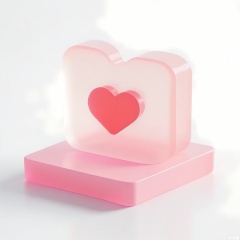 MSCZ, A photograph of a small, frosted, peach triangular logo icon with a matte texture, resting on a square, transparent, peach base. The logo features a minimalist heart silhouette in white. The white background contrasts with the warm peach tones, while soft lighting accentuates the smooth contours and frosted finish.