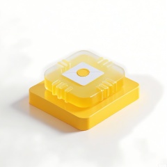 MSCZ, A photograph of a small, frosted, mustard-yellow oval logo icon with a matte texture, angled on a square, transparent, mustard-yellow base. The logo displays an abstract letter "M" in white, formed by overlapping arcs. The white background provides crisp contrast to the earthy mustard-yellow. Subtle lighting accentuates the rounded form and frosted surface.