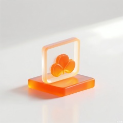 MSCZ, A photograph of a small, frosted, burnt-orange pentagon logo icon with a matte texture, positioned on a square, transparent, burnt-orange base. The logo incorporates a stylized maple leaf motif in white. The plain white backdrop emphasizes the earthy burnt-orange hue and angular geometry. Diffused lighting highlights the geometric edges and frosted finish.