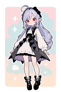 very awa,<lora:haiz_ai_illu:1>,haiz_ai,1girl,haizaz,pastel colors,thick lineart,thick outline,flat color,sticker outline,sticker,young,aged down,masterpiece,[best quality:0.25],newest,absurdres,very aesthetic,best quality,year 2024,newest,<lora:vivian-ill-Tanger:0.8>,vivian \(zenless zone zero\),vivian hairband with bow,1girl,red eyes,long hair,black footwear,long sleeves,pointy ears,bow,