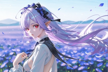 8k,best quality,masterpiece,(ultra-detailed),(high detailed skin),((artist:reoen), year 2024:0.8)1girl,[artist:wlop],[artist:ningen_mame],artist:ciloranko,[[artist:rhasta]],artist:tidsean,artist:iumu,artist:nyarko,wind,solo,She leaned into the wind and stopping herself from blowing any further across the field,swept bangs,side hair flap,linear hatching,upper body,open field,sandals,best quality,amazing quality,very aesthetic,absurdres,close-up,looking to the side,<lora:vivian-ill-Tanger:0.8>,vivian \(zenless zone zero\),vivian hairband with bow,1girl,red eyes,long hair,black footwear,long sleeves,pointy ears,bow,
