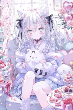 best, 1girl, animal ears, macaron, food, blue eyes, balloon, hair ornament, dog ears, socks, stuffed toy, flower, looking at viewer, white hair, indoors, window, sitting, solo, skirt, dog, white socks, cake, collar, dog tail, heart balloon, long hair, dog girl, hair bow, stuffed animal, ribbon, bow, tail, rose, cupcake, blush, black bow, choker, pink flower, heart, heart hair ornament, twintails, white skirt, closed mouth, hair ribbon, hair between eyes, two side up, curtains, pleated skirt, animal ear fluff, shirt, frilled sailor collar, long sleeves, tiered tray, character doll, jacket, pink ribbon, purple socks, heart-shaped pillow, sailor collar, pink rose, picture frame, frills, hairclip, holding, animal collar, black choker, hugging object, pillow, table, holding stuffed toy, animal, crossed bangs, couch, hug, dessert, knees up, white shirt, gift, strawberry, x hair ornament, teddy bear, sweets, candy, hair flower, plant, dress, blue skirt, fruit, drawing (object), ice cream, loose socks, black collar, purple theme, wolf ears, cardigan, cushion, purple skirt, feet out of frame, grey hair, cake slice, on couch, hairpin, white theme, fur trim, purple shirt, aqua eyes, black ribbon, thighs, sidelocks, potted plant, blue hair, pastel colors, pastry, miniskirt, doll, animal hug, white dress, virtual youtuber, chair, petals,<lora:lp29New.up2.1-000030:0.9>,