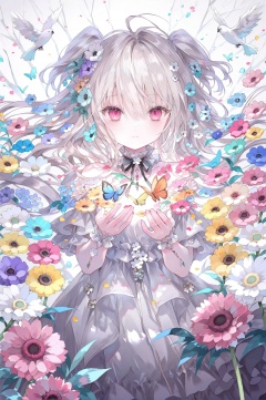 best,1girl,flower,butterfly,solo,bug,dress,long hair,looking at viewer,blue flower,anemone (flower),purple flower,hair between eyes,two side up,white dress,bird,pink flower,grey hair,red eyes,hair ornament,closed mouth,smile,hair flower,pink eyes,yellow flower,white flower,petals,blue butterfly,bare shoulders,white hair,wrist cuffs,hands up,frills,animal,ahoge,off-shoulder dress,off shoulder,very long hair,floating hair,straight-on,frilled choker,twintails,red flower,choker,daisy,short sleeves,grey dress,light smile,cowboy shot,bow,parted lips,frilled dress,leaf,white butterfly,upper body,<lora:lp29New.up2.1-000030:0.9>,