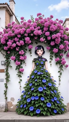 a barbie doll stands in front of a white wall adorned with a wreath of pink and purple flowers. The doll's dress is adorned with blue flowers