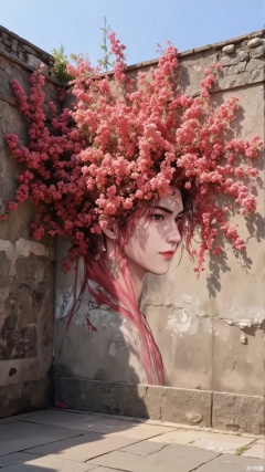 A man with red hair was painted on an ancient city wall, his hair was wrapped in morning glory