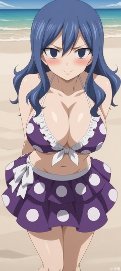 (8k),HD,(masterpiece),Full-body shot,1girl, solo, long hair, breasts, looking at viewer, blush, smile, bangs, blue eyes, skirt, large breasts, navel, cleavage, hair between eyes, closed mouth, blue hair, collarbone, swimsuit, bikini, cowboy shot, outdoors, frills, sky, day, v-shaped eyebrows, ocean, beach, arms behind back, polka dot, frilled bikini, purple bikini, bikini skirt, polka dot bikini