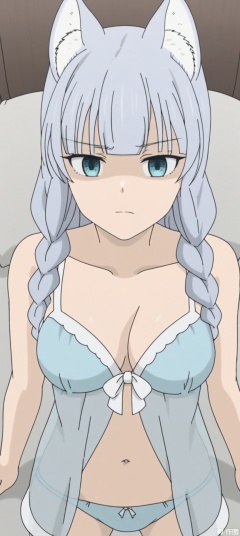 (8k),HD,(masterpiece),Full-body shot,1girl, solo, breasts, looking at viewer, navel, cleavage, medium breasts, underwear, collarbone, upper body, indoors, see-through, lingerie, babydoll,high angle shot,medium shot,1,long hair, bangs, blue eyes, animal ears, braid, grey hair, cat ears, twin braids, :3, wolf ears, cloak