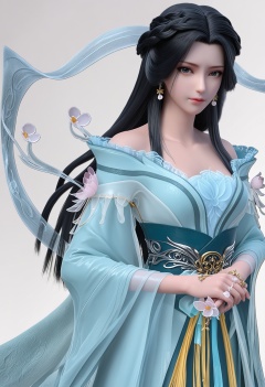 score_9,high detail,best quality,shiny skin,shiny,1girl,solo,black hair,long hair,jewelry,earrings,dress,white background,closed mouth,bare shoulders,simple background,realistic,hagoromo,braid,shawl,sash,flower,blue dress,long sleeves,looking at viewer,upper body,<lora:QQSponyjiangliV1:0.8>,<lora:Pony_DetailV2.0:0.8>,<lora:皮肤凹痕:0.1>,
