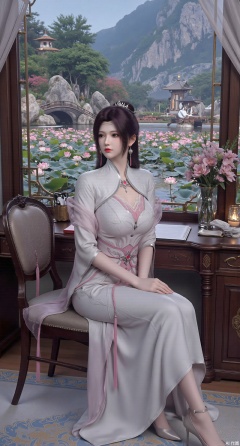 SFW,(masterpiece, best quality:1.2),1girl, solo, long dress,Ancient princess's boudoir with bright color palette,,(huge breasts:2.59),(full breasts:2.39), Hanfu-clad maiden sitting by latticed window desk in romantic daydreaming posture, classical Chinese garden through window showcasing lotus pond filled with blooming pink and white lotuses, delicate ink-wash painting style, interior featuring rosewood furniture with mother-of-pearl inlay, silk curtains fluttering in breeze, porcelain stationery set on desk, distant view of curved bridges and pavilions in garden, ultra HD rendering with crisp details on embroidered garments and translucent lotus petals,,(huge breasts:2.99),(full breasts:2.99),,XtianqiongY,XliumeiY,XyueliuY,Xxiaowu,Xyusanniang,Xxuenv,XchuxuanerXY,XchuxuanerX,Xhuangnv,Xshangguanweier,XyunyunX,XqingnvzongZM,XanmiaoyiXY,XyunyunXY