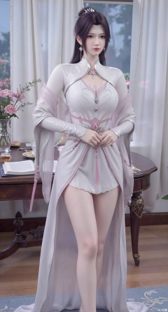 SFW,(masterpiece:1.2),best quality,Ultra clear, wallpaper, 8k, masterpiece, 1girl, solo, long hair, breasts, looking at viewer, bangs, large breasts,long dress,, bare shoulders, jewelry, black hair, standing, purple eyes, full body, flower, thighs, indoors, hair bun, long dress, high heels, cup, see-through, book, bare legs, window, table, white footwear, standing on one leg, curtains, pink flower, side slit, vase, ,Xanmiaoyi,Xyunwangshu,XlishaoyinY,Xbaixue,XanmiaoyiY,Xxiuqiuhua,XbaiyuerongY,XyunyunX,XqingnvzongZM,Xjuzi,Xshangguanweier,XanmiaoyiXY,XyunyunXY