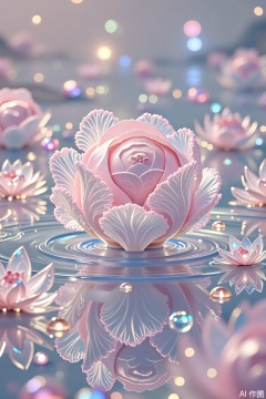 The image depicts a surreal scene with a large, intricately designed pink cabbage floating on a reflective water surface. The cabbage has delicate, lace-like patterns on its leaves, and it appears to be gently rising or falling in the water. Surrounding the cabbage are smaller, similarly styled pink flowers and crystal-like structures that reflect light, creating a dreamy, ethereal atmosphere. The background is filled with soft, glowing lights and abstract shapes, enhancing the magical and fantastical feel of the scene.