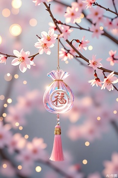 The image features a delicate, crystal-encrusted ornament hanging from a branch adorned with pink cherry blossoms. The ornament is shaped like a pouch and is embellished with sparkling gemstones, giving it a luxurious appearance. The word "福" is prominently displayed in the center of the pouch, written in traditional Chinese characters. The background is softly blurred, creating a dreamy, ethereal atmosphere with bokeh effects of light pink and white, enhancing the overall aesthetic. The pink tassels at the bottom of the ornament add a touch of elegance and movement.