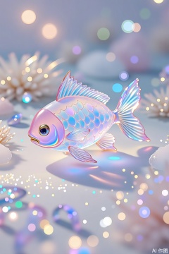 The image depicts a beautifully designed fish made of a translucent material that reflects a spectrum of colors, including pink, blue, and purple. The fish has a shimmering, iridescent appearance, with its scales and fins catching the light in a way that creates a mesmerizing effect. The background is a soft, dreamy setting with bokeh effects, giving the impression of a magical, underwater environment. There are also sparkling, glittery elements scattered throughout the scene, enhancing the overall ethereal and whimsical atmosphere.