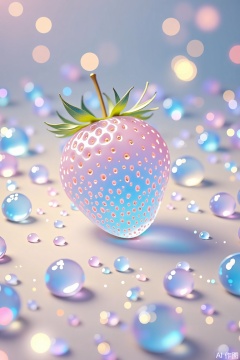 The image depicts a visually captivating scene centered around a large, glossy strawberry. The strawberry has a gradient coloration, transitioning from a soft pink at the top to a light blue towards the bottom, with small, shiny droplets scattered across its surface. The strawberry's leaves are a vibrant green, adding a touch of natural contrast to the otherwise pastel and shimmering background. Surrounding the strawberry are several translucent, iridescent water droplets, each reflecting a spectrum of colors that enhance the overall dreamy and ethereal atmosphere. The background is softly blurred, with bokeh effects creating a bokeh halo of pastel colors, including shades of pink, blue, and purple, which complement the central subject beautifully. The entire scene exudes a whimsical and magical quality, with the combination of the glossy texture, vibrant colors, and soft lighting creating a sense of enchantment.