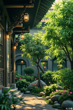 The image depicts a serene garden scene with lush green bamboo and other vegetation. Hanging lanterns in shades of green and yellow are suspended from the roof, casting a soft, warm light. The structure appears to be a traditional East Asian pavilion, with intricate wooden carvings and lattice windows. The background is slightly blurred, emphasizing the depth and tranquility of the setting.