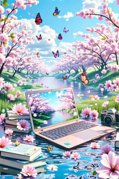 The image depicts a serene and picturesque scene with a laptop displaying a beautiful landscape of cherry blossoms and a river. The laptop is placed on a reflective surface, surrounded by scattered books, a camera, and blooming flowers. Butterflies are flying around, enhancing the dreamy and tranquil atmosphere. The background features more cherry blossom trees and a bright blue sky with fluffy clouds, creating a peaceful and idyllic setting.
