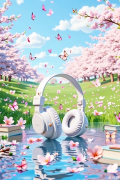 The image depicts a serene outdoor setting with a focus on a pair of white headphones resting on a reflective surface, possibly water, surrounded by floating cherry blossoms and fluttering butterflies. The background features a lush green field dotted with pink cherry blossoms under a clear blue sky. The scene exudes a peaceful and dreamy atmosphere, with the headphones and other objects suggesting a relaxing environment for listening to music or enjoying nature.