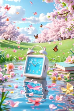 The image depicts a serene and dreamy scene with a floating digital clock in the foreground, surrounded by water and floating flowers. The clock has a modern, sleek design with a blue face and white numbers. Around the clock, there are delicate butterflies and floating petals, creating a whimsical atmosphere. In the background, there is a lush green field with blooming cherry blossoms, and a stack of books is partially submerged in the water, adding to the surreal and tranquil setting. The overall composition evokes a sense of calm and beauty, blending natural elements with modern technology.