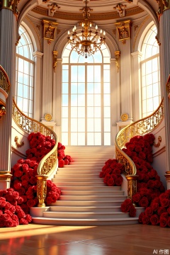 The image depicts a grand, opulent interior with a luxurious staircase. The staircase is adorned with cascading red roses, creating a striking contrast against the light-colored stone. The walls are embellished with intricate gold moldings, and the ceiling features a large, elegant chandelier. The staircase leads to a set of tall, arched windows that allow natural light to flood the space, casting a warm glow over the area. The floor is made of polished wood, and the overall atmosphere is one of elegance and sophistication.